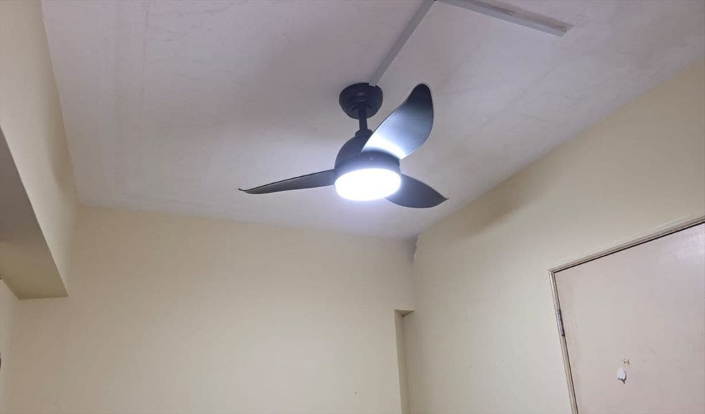 Cooling: Modern 3-blade ceiling fan with integrated LED lighting.