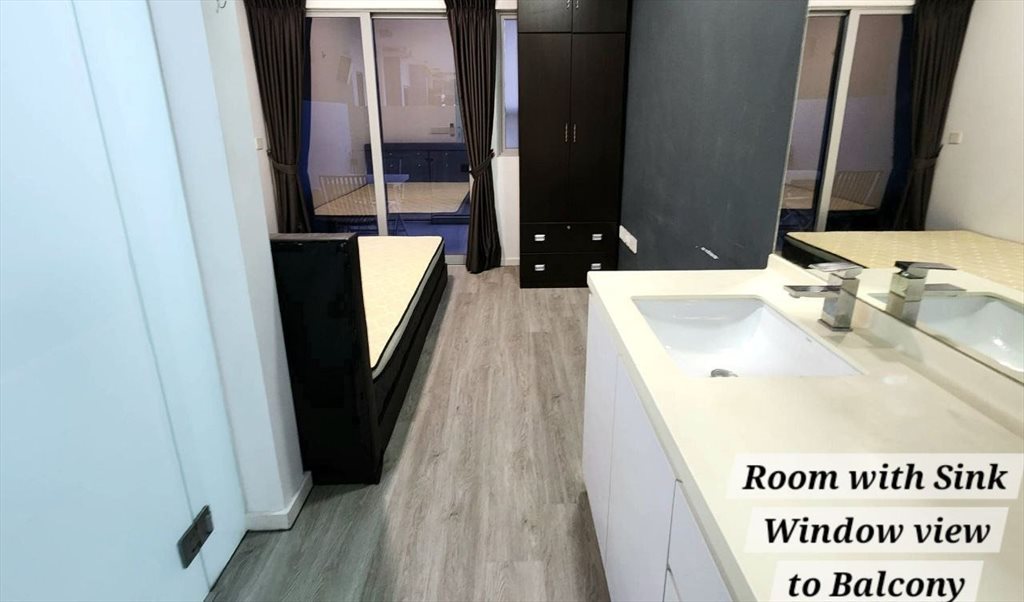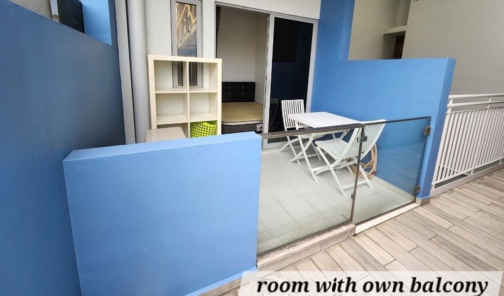 Maximum 2 adults. Room with full privacy, bathroom, sink, aircon, queen bed, wardrobe, table & chairs, mirror, storage cabinets, balcony direct access to swimming pool, morning sun.