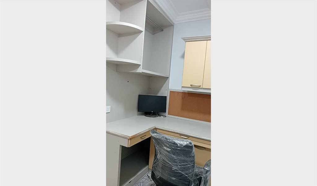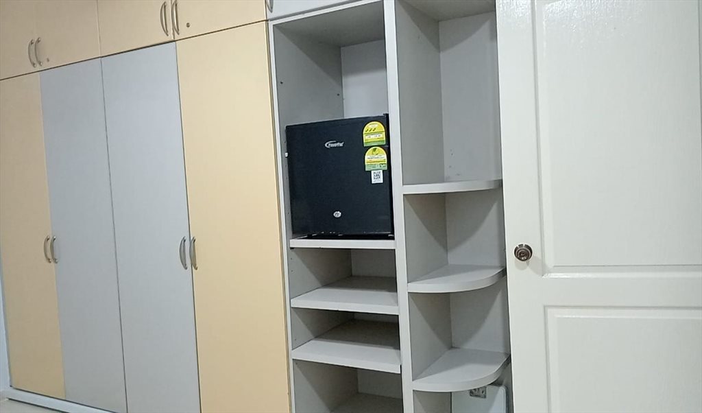 Queen size bed, wardrobe, table, chair, ceiling fan and mini fridge provided,