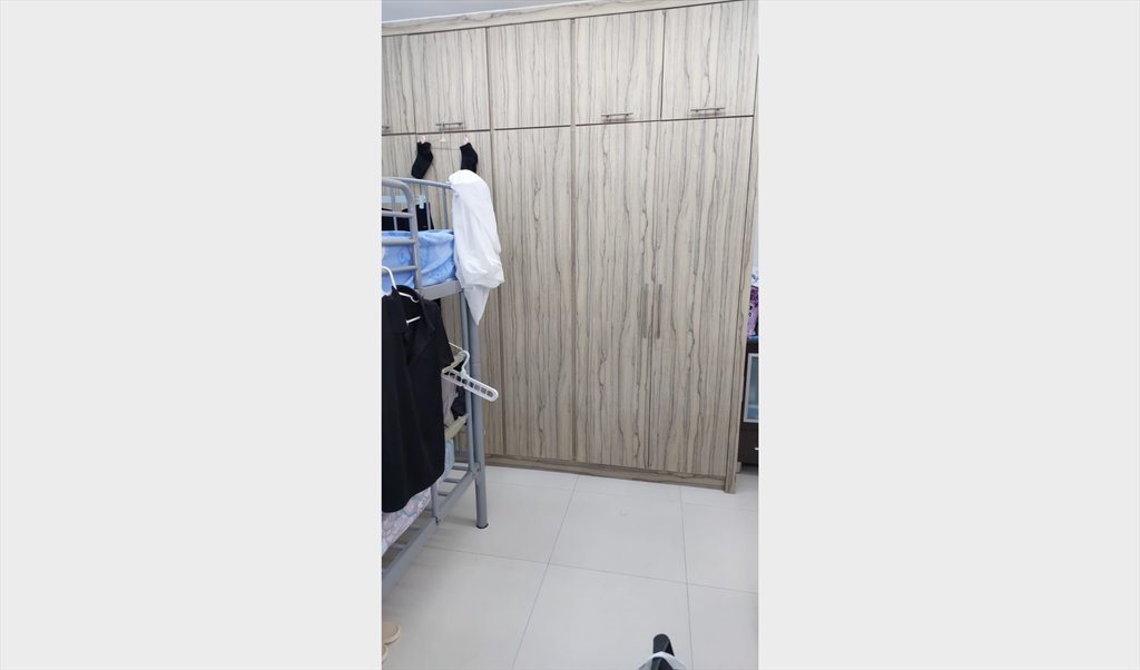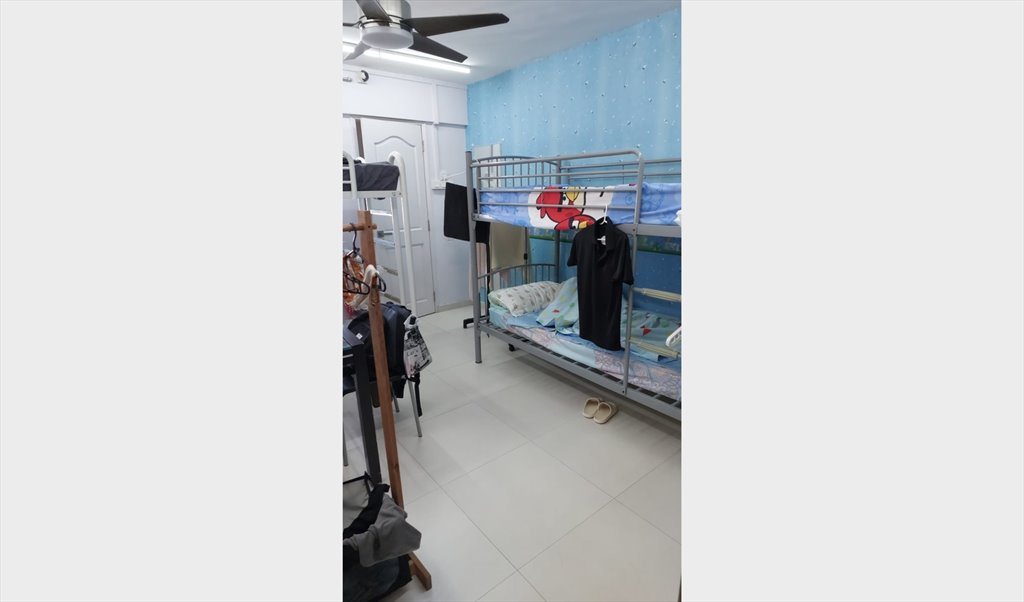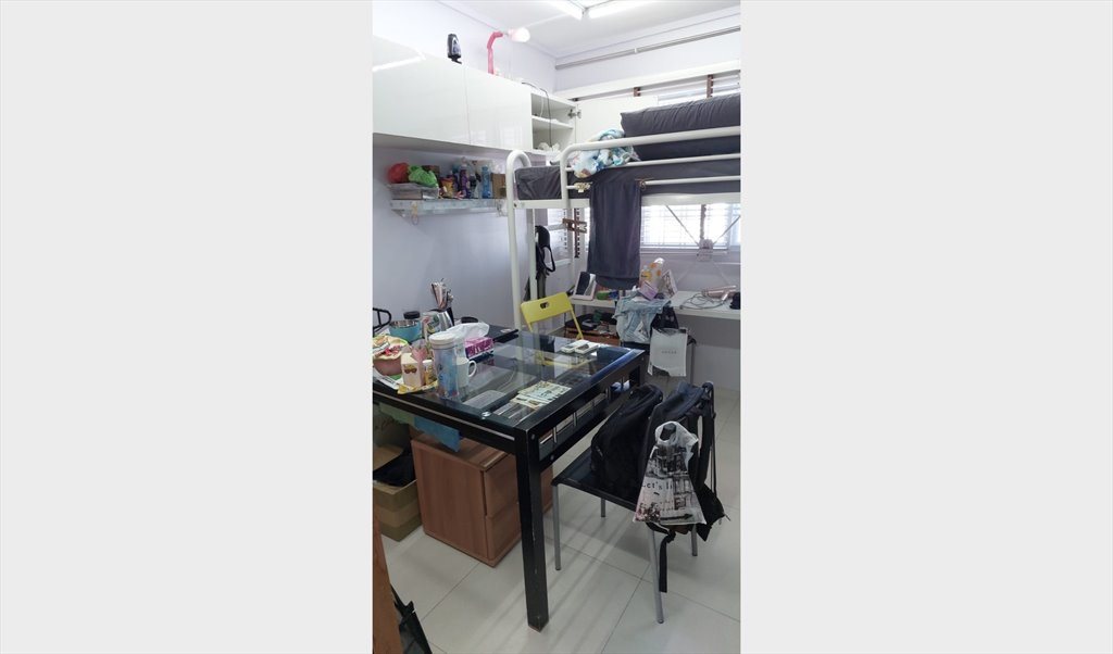 One double decker, and one upper single bed (below is a study table), wardrobe, table, chair and ceiling fan provided,
