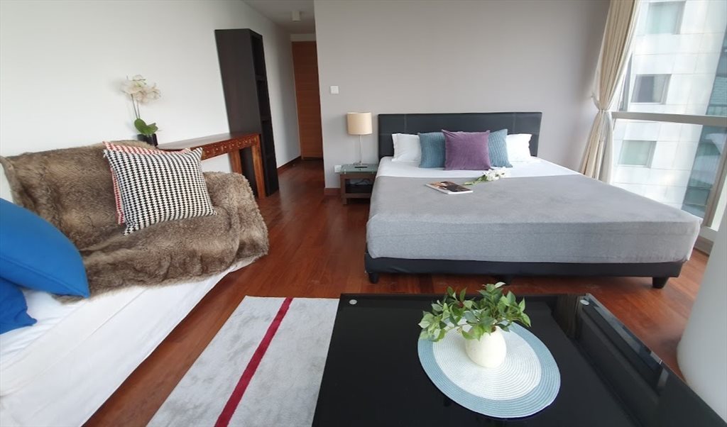 The room is huge with 1 big queen-sized beds and 1 sofa bed. There's a private bathroom,
