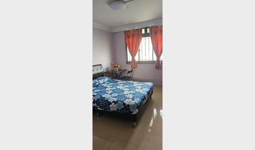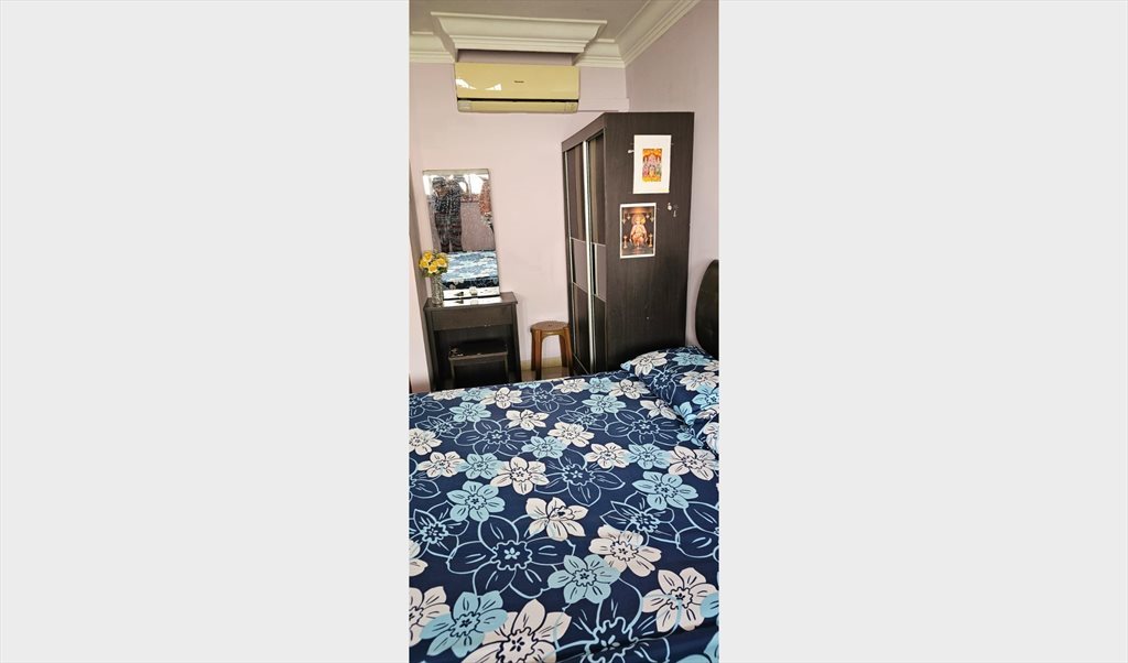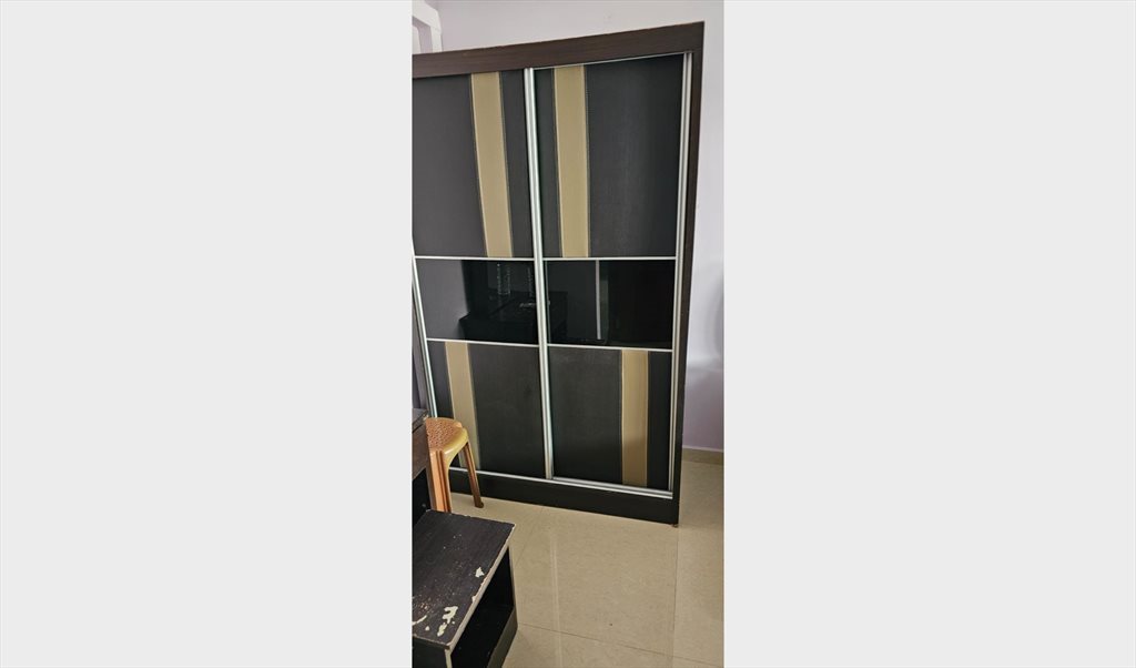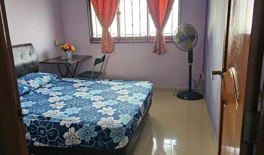 Queen size bed, wardrobe, table, chair and standing fan provided,