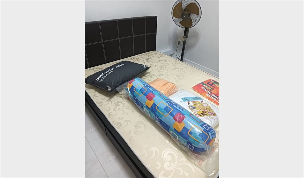 Queen size bed, wardrobe, study table, chair and standing fan provided,