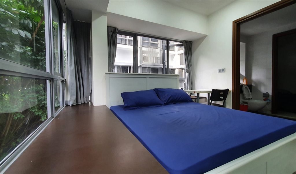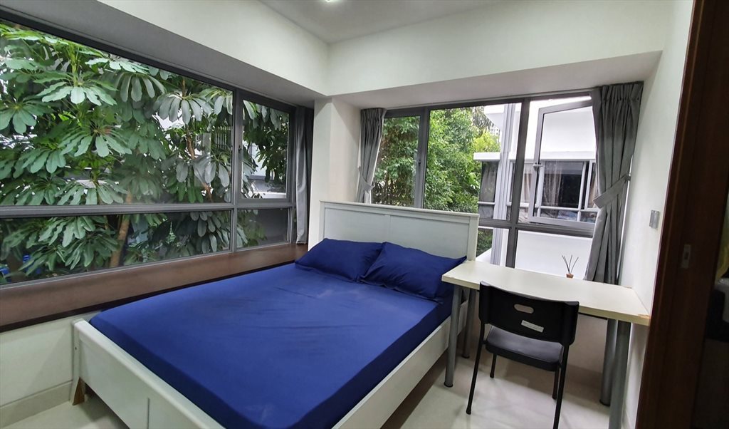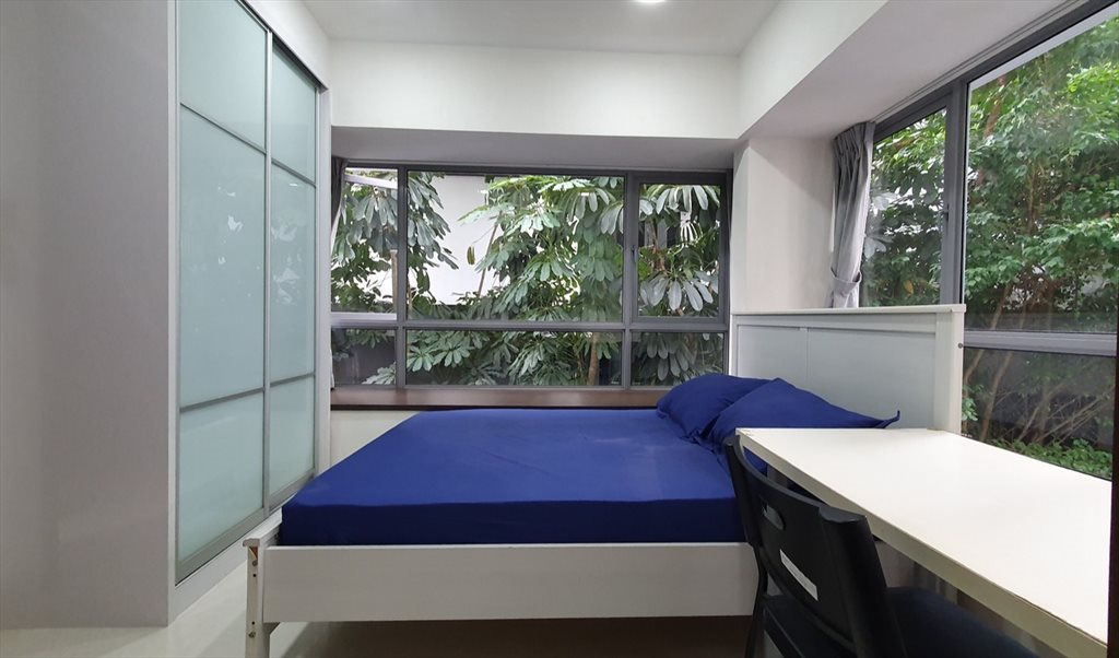 - Fully furnished with queen-sized bed/mattress, wardrobe, study table, chair, electricity sockets and plenty of storage space on the bay windows.