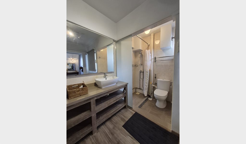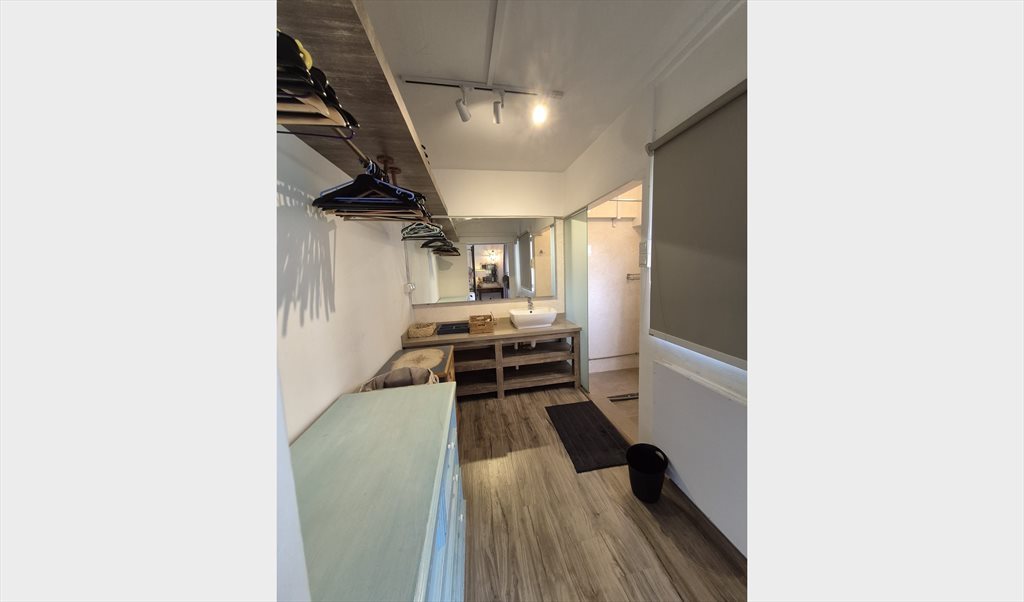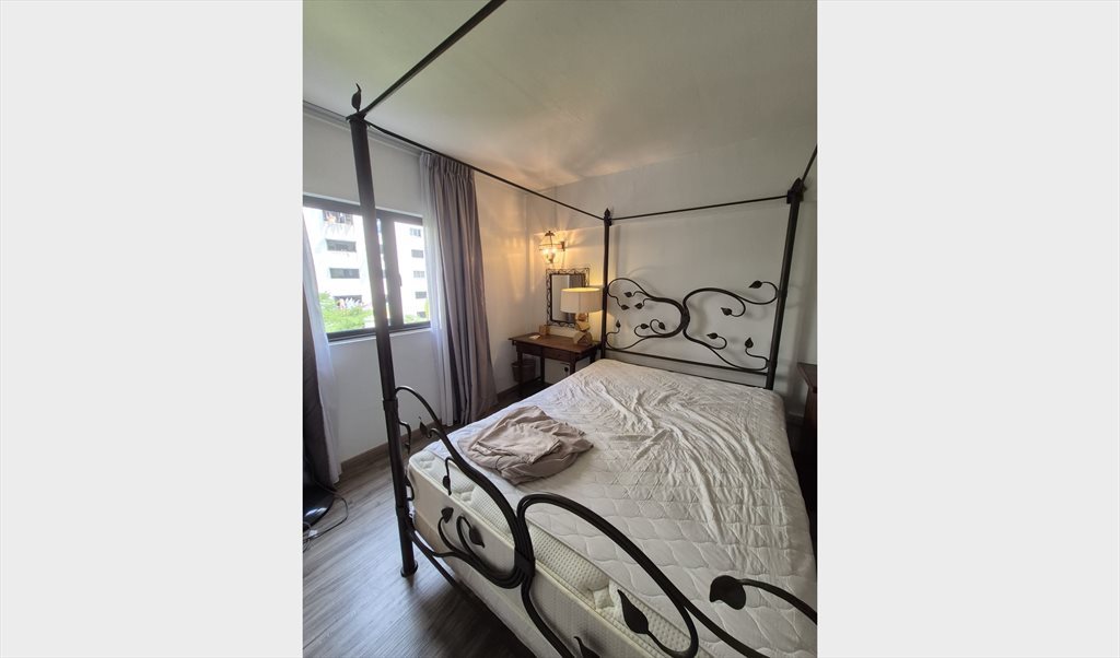 Furnished master bedroom with walk-in bathroom for 1-2 tenant(s) to share a spacious 2-bedroom HDB flat (990 sq ft / 92 sqm) with one other person in a green and quiet neighborhood. The room is ready to move in. Rental: 1800 SGD (single) 2000 SGD (couple).
