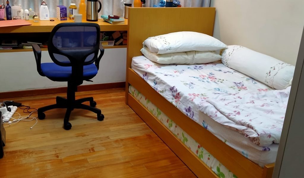 Single bed (underneath got another bed), wardrobe, study table, chair and table fan provided,