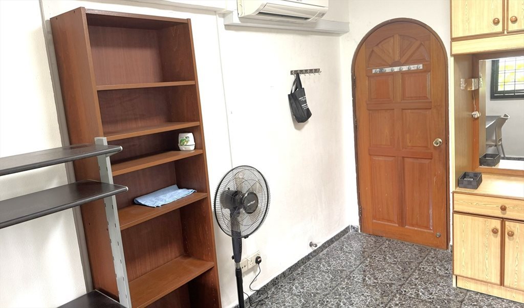1 Cozy common room for rent. Includes a built-in wardrobe, a fan, and a small desk. The room is well-lit and has a new air conditioner.